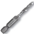 Drill/tap high-speed steel bit, split point with web thinning. High-quality hex shank to ensure strong connection to drill chuck. Complete hole drilling, tapping and deburring or countersinking in one operation with power drill. Designed to tap up to 10 ga metal. Back taper or deburr or countersink beyond tap to prevent thread damage from over-drilling.