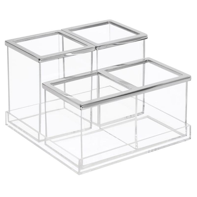 Store and organize your bathroom essentials with this InterDesign clarity vanity organizer. This clear plastic organizer features 4 square compartments with tray and silver accents. Perfect for organizing your bathroom countertop, vanity, office desk and wherever you need additional organization.