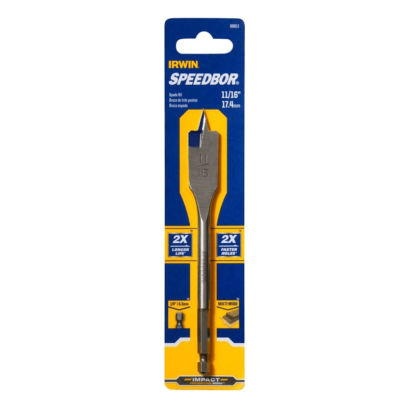 Irwin 88811 Spade Drill Bit, 11/16 in Dia, 6 in OAL, Flat Flute, 1/4 in Dia Shank, Hex Shank