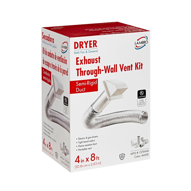 The Lambro white plastic hood clothes dryer exhaust vent kit featuring 4 in x 8 ft semi-rigid duct UL 2158A is ideal for venting through the wall. This kit is used for clothes dryer exhaust and other general venting applications that require moist air and humidity from exiting the home. The hood allows for maximum airflow while reducing back flow of exhaust air. The built in damper prevents back drafts while the removable guard prevents critters from entering the home through the vent. The plastic vent has a UV additive to prevent premature fading due to the sun..