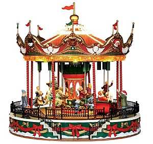 This animated figurine displays villagers enjoying a ride on Santa's Carousel. The Carousel revolves while the animals rise and fall.