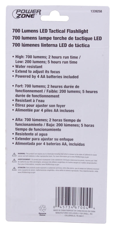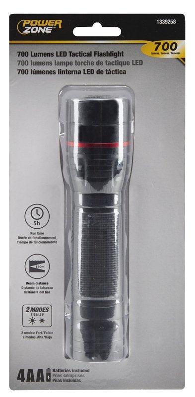 PowerZone 12098 Tactical Flashlight, AA Battery, LED Lamp, 700 Lumens, 150 m Beam Distance, 5 hrs Run Time, Black