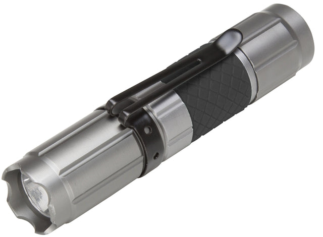 PowerZone Tactical LED Flashlight has a 1.5 V voltage rating. Includes (1) AA battery.