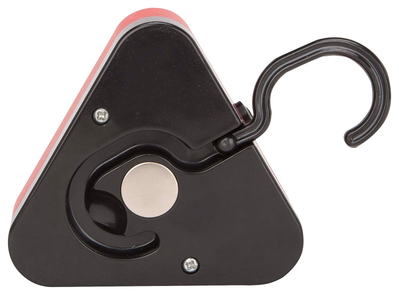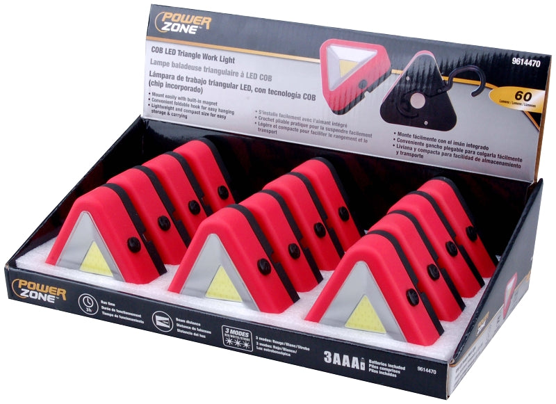 The PowerZone COB LED triangle work light is 60 lumens, beam distance: 10m, run time: 3hrs, 3 modes: red/white/strobe and it can be mounted easily with the built-in magnet. The convenient foldable hook makes it easy for hanging and it's lightweight and compact size for easy storage & carrying. 3 AAA batteries are included.