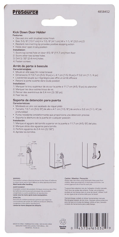 ProSource CL-230SN-PS Door Holder, 5-3/8 in L, 1-5/8 in W, 2 in H, Attaches to Door Mounting, Rubber/Zinc