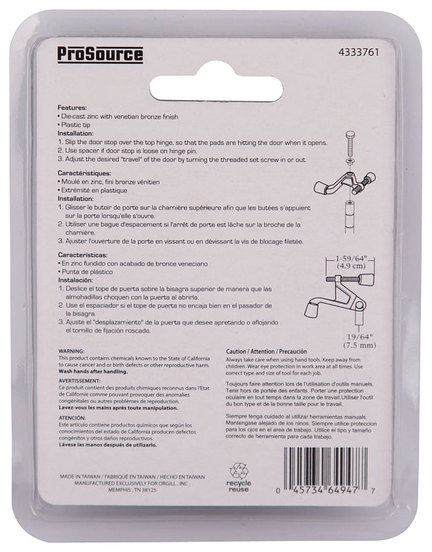 ProSource H20-B038C-VB-PS Heavy-Duty Hinge Pin Door Stop, 2-3/4 in Projection, Die-Cast Zinc & Plastic, Venetian Bronze