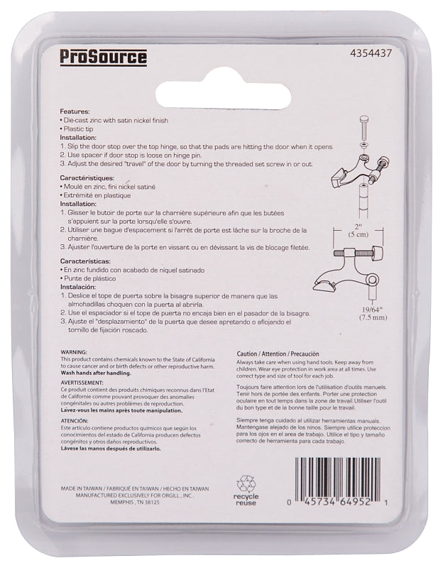 ProSource H20-B043C-PS Deluxe Hinge Pin Door Stop, 2-5/8 in Projection, Die-Cast Zinc & Plastic, Satin Nickel