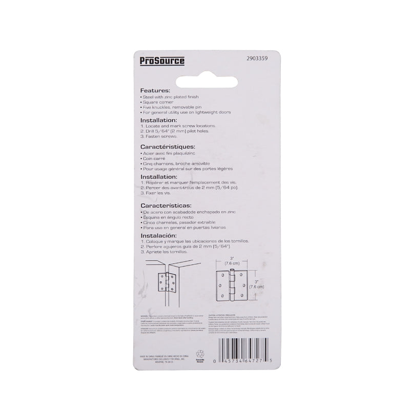 ProSource LR-040-PS Utility Hinge, Steel, Zinc, Removable Pin, 180 deg Range of Motion, Full Mortise Mounting