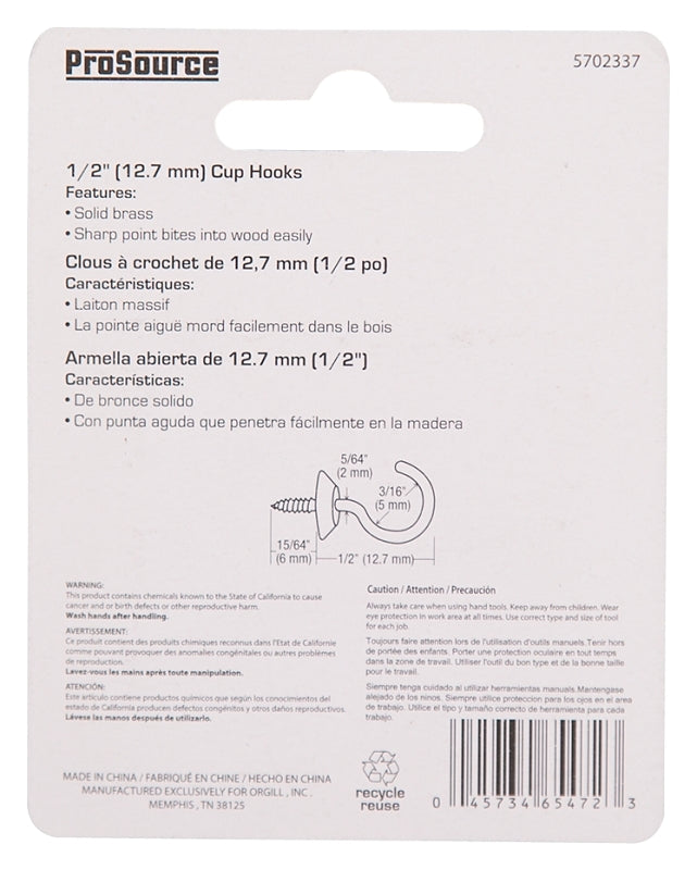 ProSource LR-381-PS Cup Hook, 3/16 in Opening, 2.5 mm Thread, 3/4 in L, Brass, Brass is backordered and will ship as soon as it is back in stock.