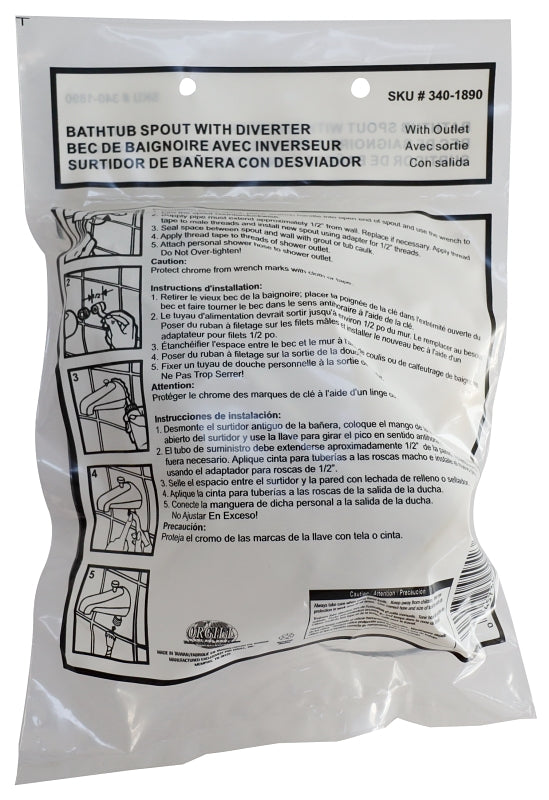 ProSource PMB-048 Bathtub Spout with Diverter, 5-1/4 in L, 3/4 x 1/2 in Connection, IPS, Zinc, Chrome Plated