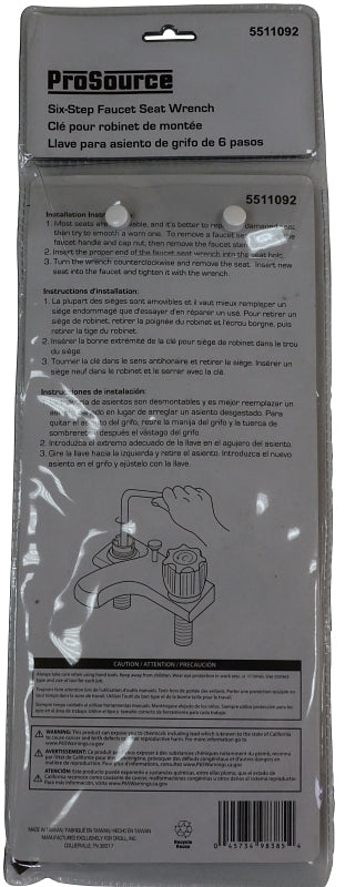 This 6-step wrench fits most faucet seats. It's used to remove and install replaceable seats. Made of hardened steel..