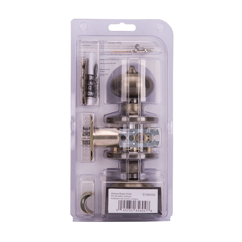 For keyed exterior doors. Both knobs lock or unlock by key outside or turn button inside. All metal components. Solid steel latch assembly. Rust-resistant solid brass keyway for more security. Seamless 1-piece knob for extra strength. Square spindle for right or left handed installations. Easy installation. Cylinder drilled for construction keying. Door prep 2-1/8 in Crossbore, 1 in Edge Bore, 1 x 2-1/4 in Latch Face. Fits 1-3/8 to 1-3/4 in doors.