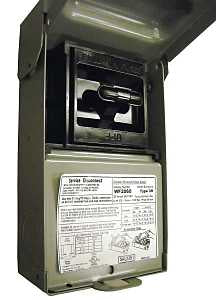 For use as service disconnect. Outdoor enclosed pullout switch. Type 3R, 240 VAC, single phase. Removable door. cULus Listed.