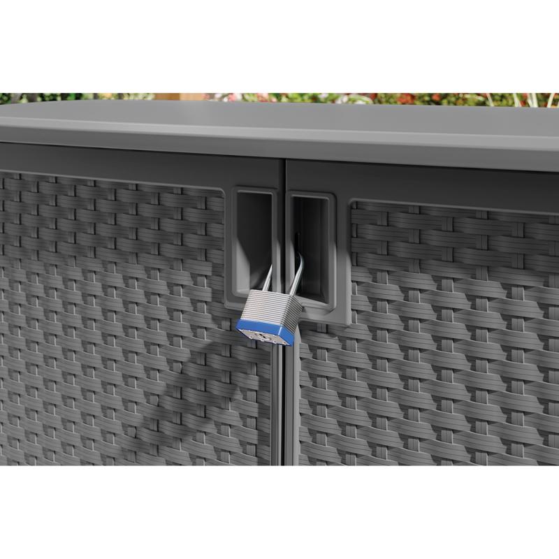 Add sophisticated style and storage to your deck or patio with this Suncast Outdoor Cabinet. Offering a 97 gal. interior capacity, the cabinet is large enough to accommodate lawn and garden tools, grill accessories, and more. The included metal-reinforced, adjustable shelf further increases your organizational opportunities. The durable resin construction is accented by sturdy, pad-lockable doors that provide superior strength and security (lock not included). Plus, the wicker design looks great in any outdoor setting. Increase your storage capacity while beautifying your space with this Suncast Outdoor Cabinet.
