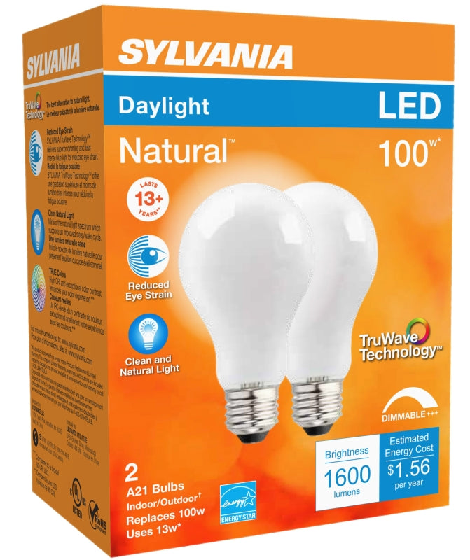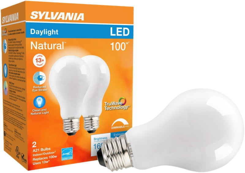 Sylvania Natural LED Bulb, General Purpose, Wattage Rating: 13 W, 120 V, Lamp Base: E26, Lamp Shape: A21, Lamp Finish: Frosted, Lumens: 1600 Lumens, Dimmable: Dimmable, Light Color: Daylight, Average Life: 15,000 hr, Incandescent Equivalent: 100 W