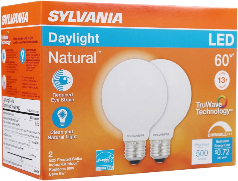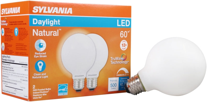 Sylvania 40768 Natural LED Bulb, Globe, G25 Lamp, 60 W Equivalent, E26 Lamp Base, Dimmable, Frosted, Daylight Light