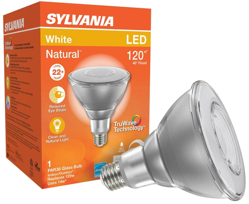Sylvania 40905 Natural LED Bulb, Floodlight, PAR38 Lamp, E26 Lamp Base, Dimmable, Clear, Cool White Light