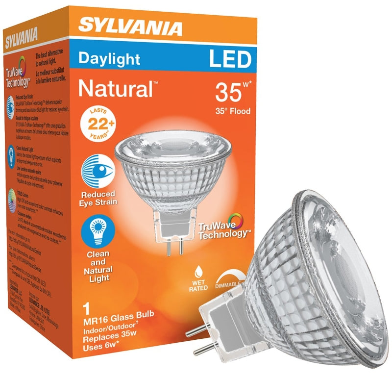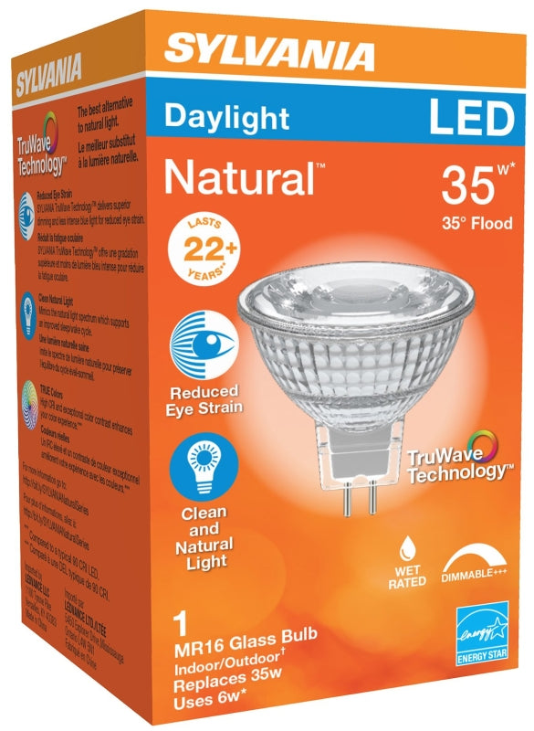Sylvania 40928 Natural LED Bulb, Track/Recessed, 450 Lumens, 6 W, MR16 Lamp, G5.3 Lamp Base, Dimmable, Cool White