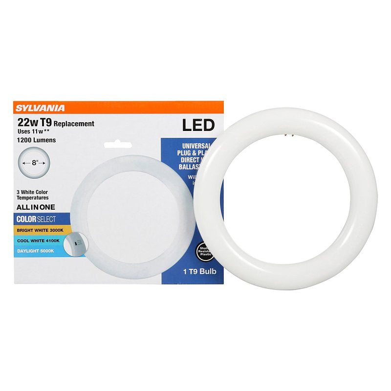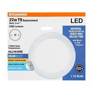Sylvania LED Bulb, Circline, 11 W Wattage, 120/277 V, G10Q 4-Pin Lamp Base, T9 Lamp, 1200 Lumens Lumens, Bright White/Cool White/Daylight Light, 3000, 4100, 5000 K Color Temperature, 82 CRI, 36,000 hr Average Life, Dimensions: 8 in Dia, Incandescent Equivalent: 22 W, Suitable for: Universal