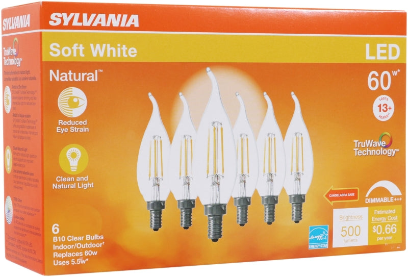 Sylvania TruWave LED Bulb B10 Lamp, Wattage Rating: 5.5 W, 120 V, Lamp Base: E12 Candelabra, Lamp Shape: B10, Lamp Finish: Clear, Lumens: 500 Lumens, Dimmable, Color Temperature: 2700 K, Color Rendering Index (CRI): 90 CRI, Average Life: 15,000 hr, Incandescent Equivalent: 60 W