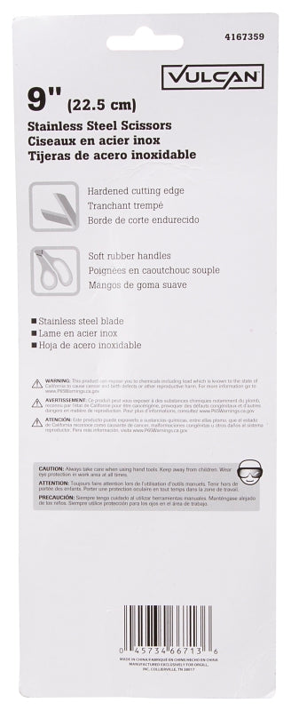 The Vulcan scissor has a stainless steel blade with a rubber handle. The OAL is 9 in.