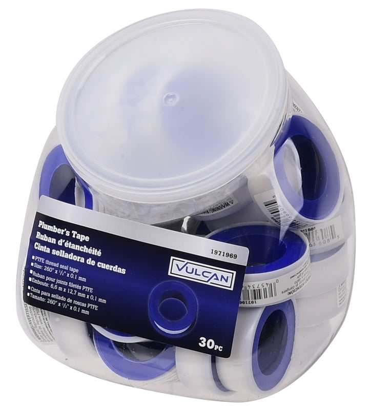 Vulcan W974 Thread Sealing Tape, 260 in L, 1/2 in W, PTFE, White, Pack of 30